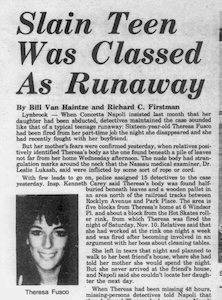 In December 1984, the body of 16-year-old Theresa Fusco was found buried under leaves in a wooded area near the roller-skating rink where she had worked in Lynbrook, in Nassau County, New York. Several law enforcement agencies responded and began collecting evidence and investigating. They determined her body had been there for weeks and she had been sexually assaulted and strangled. Three men were later convicted of the murder, but DNA testing unavailable in the 1980s found that someone other than the three had committed the killings and they were exonerated in 2005.